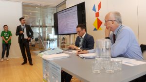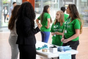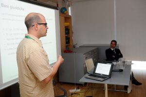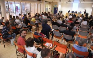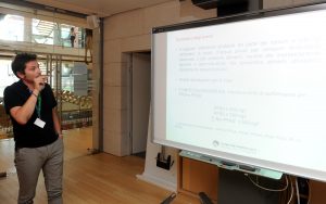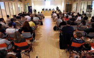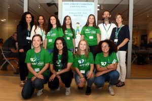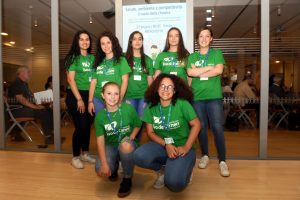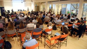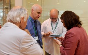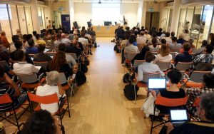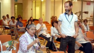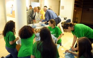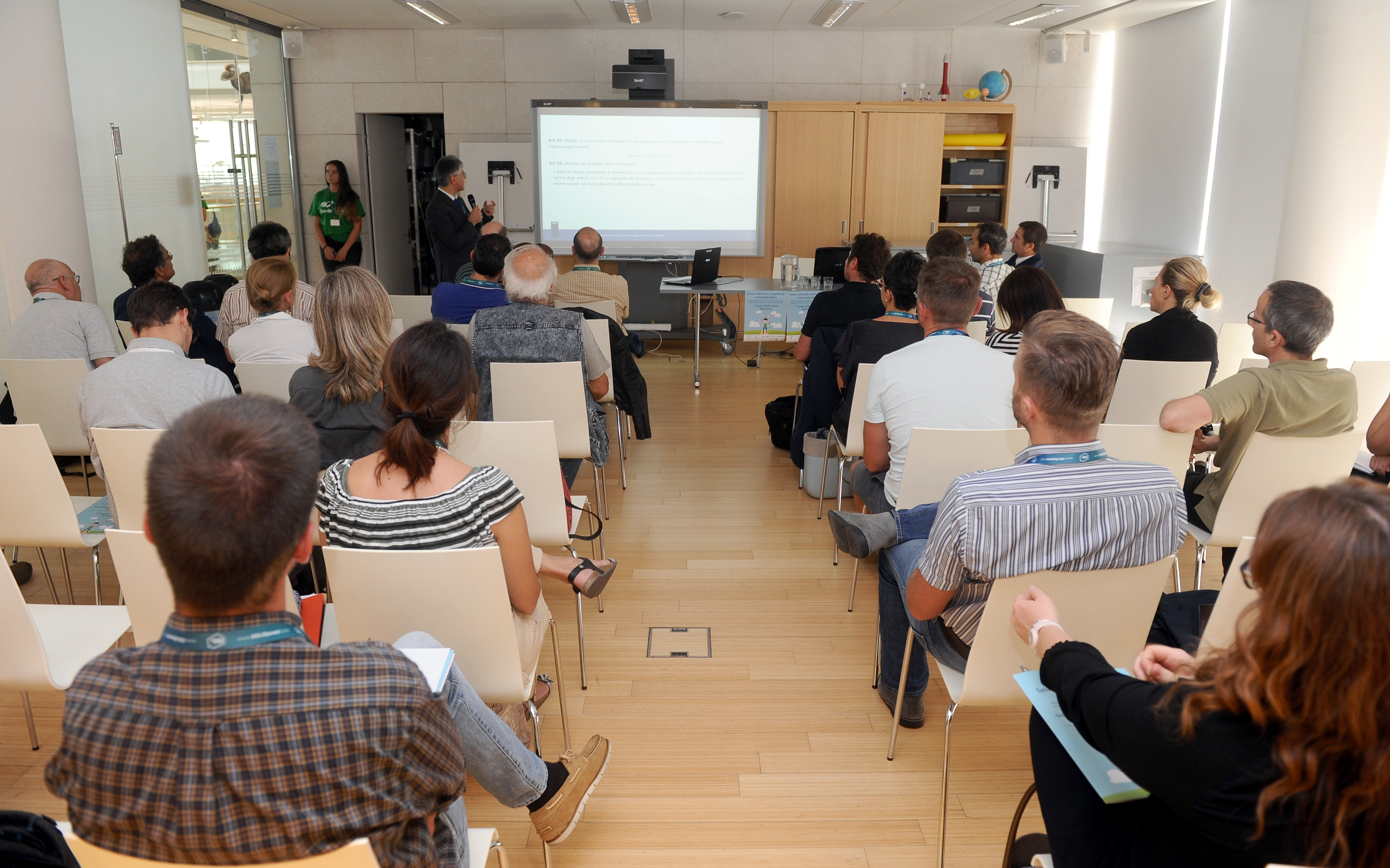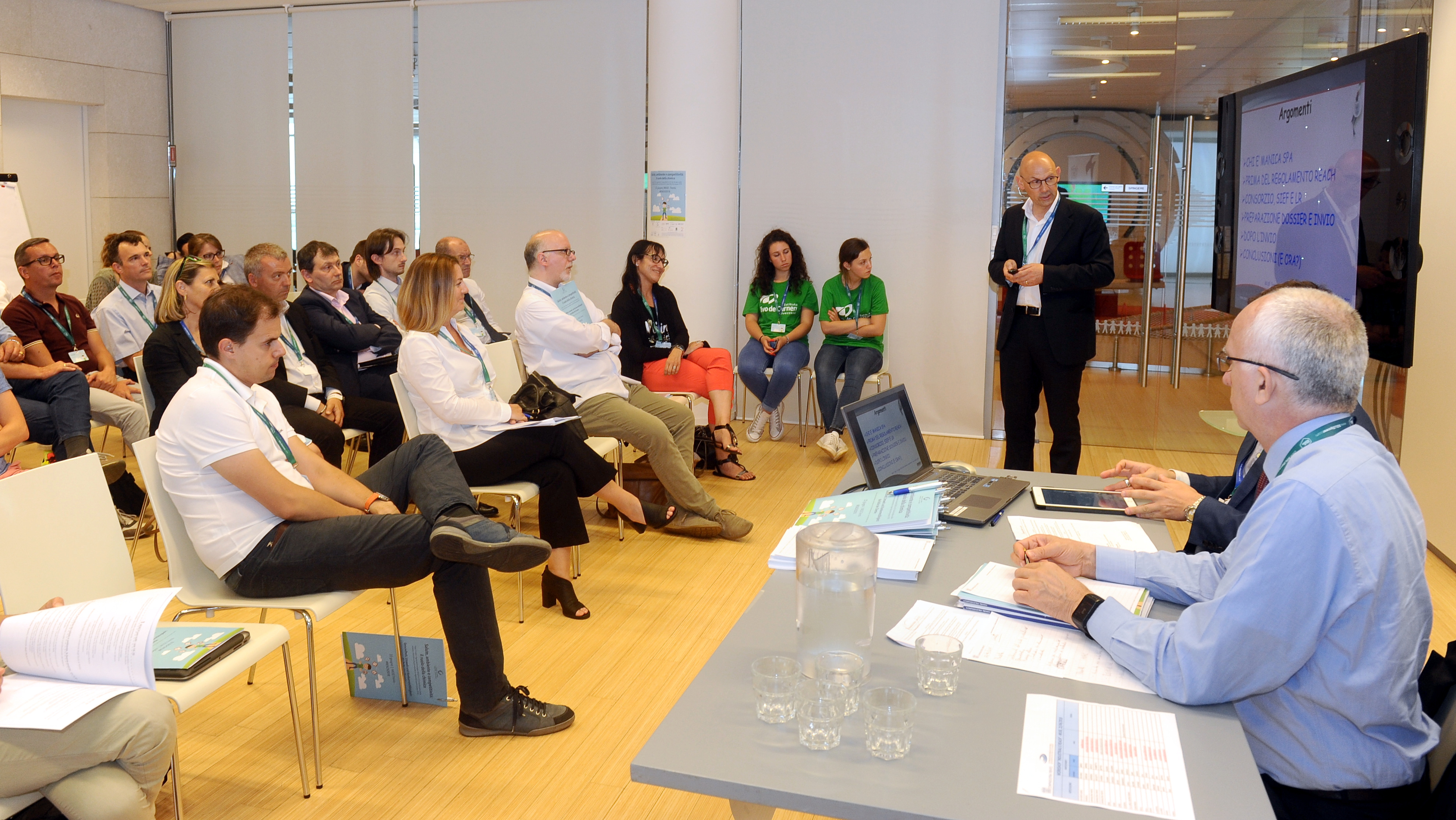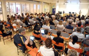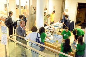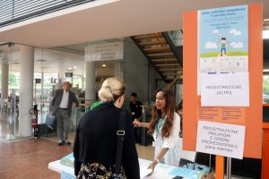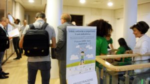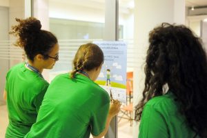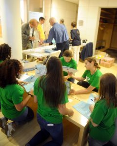 Preparazione cartellette con postIT per domande o feedback, le ragazze in maglietta verde sono le studentesse dell’Itituto De Carniei che hanno prestato (ottimo) servizio volontario durante il convegno.